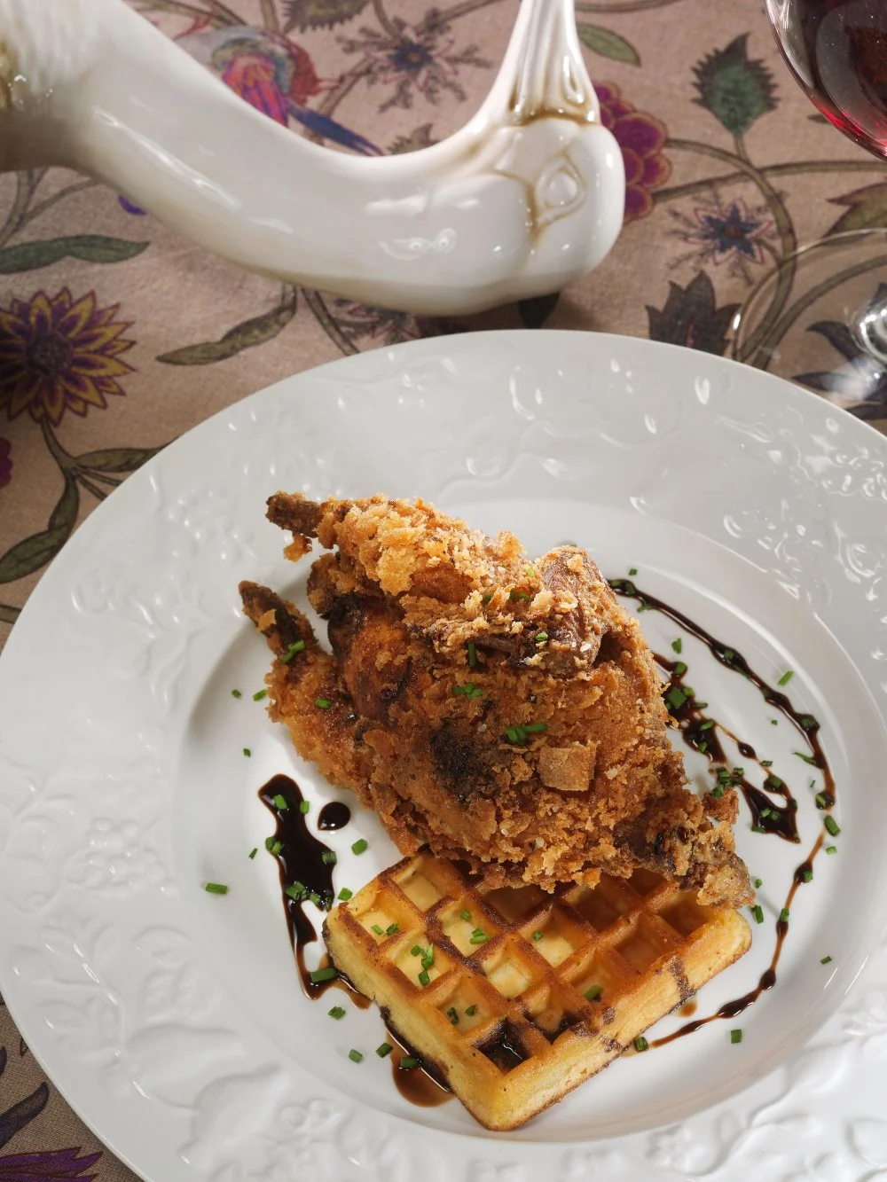 ШАГ 4 Поджарить вафли и смазать смесью сливочного масла и острого красного перца. Подавать перепелок с вафлями, сбрызнув сиропом.