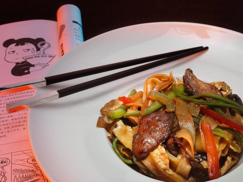 Широкая лапша с бараниной и лотосом