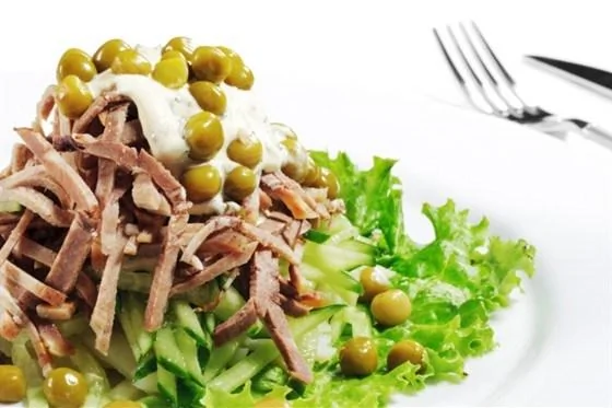 ШАГ 3 Смешать поджаренный лук и порезанное мясо. Добавить горошек, заправить майонезом.