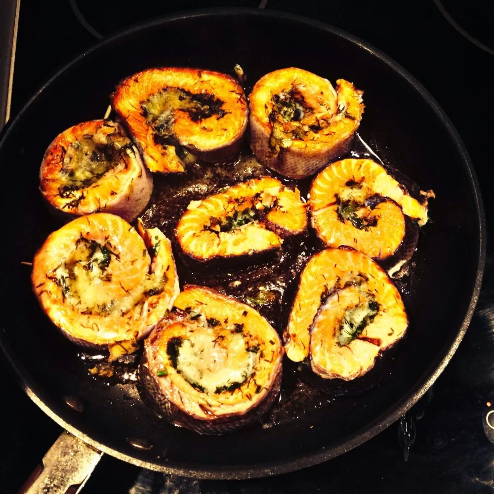 ШАГ 5 С усилием свернуть филе вдоль туловища рыбы, начиная от хвоста. У вас должен получиться довольно объемистый рулет. Сцепить рулет деревянными шпажками, чтобы рулет не развернулся.