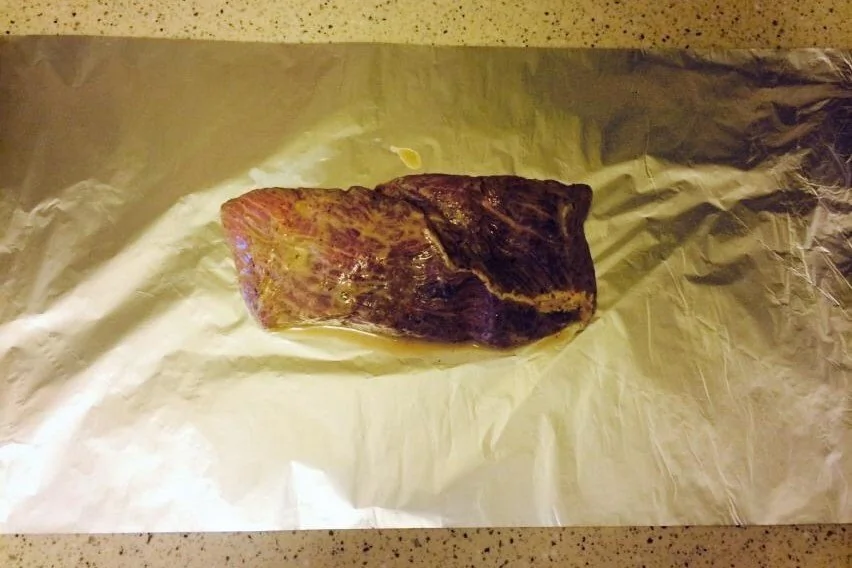 ШАГ 4 Завернуть мясо в фольгу и запекать в предварительно разогретой до 190 градусов духовке 25 минут. После чего вытащить ростбиф, открыть фольгу и снова отправить в духовку на 20 минут.