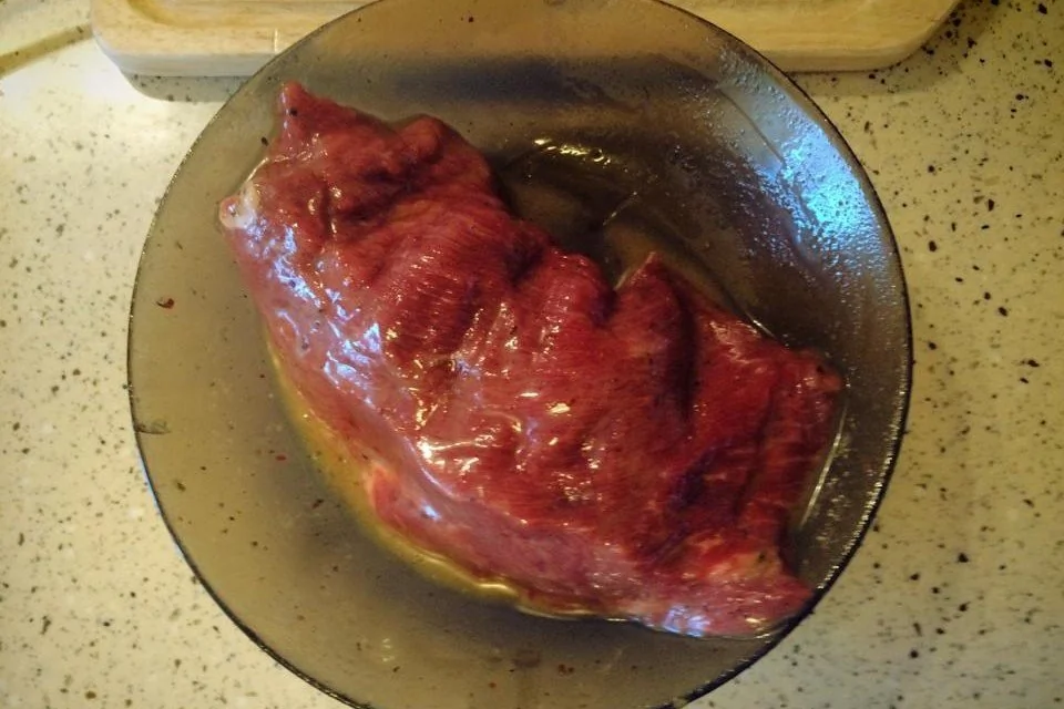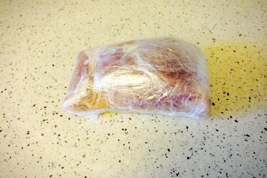 ШАГ 3 Обернуть пищевой пленкой и оставить мариноваться минимум на час (если более 4 часов, то положить мясо в холодильник).