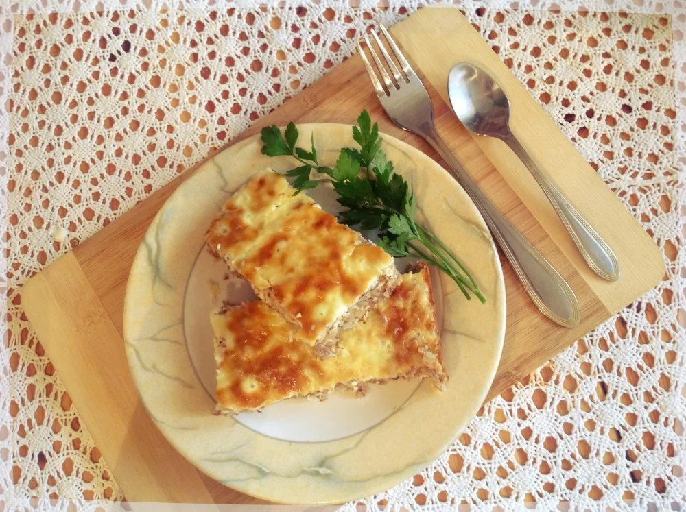 ШАГ 3 Полученную массу выложить слоем 2,5–3 см на смазанный маслом и посыпанный сухарями противень. Сверху залить яйцом, смешанным с оставшейся сметаной.