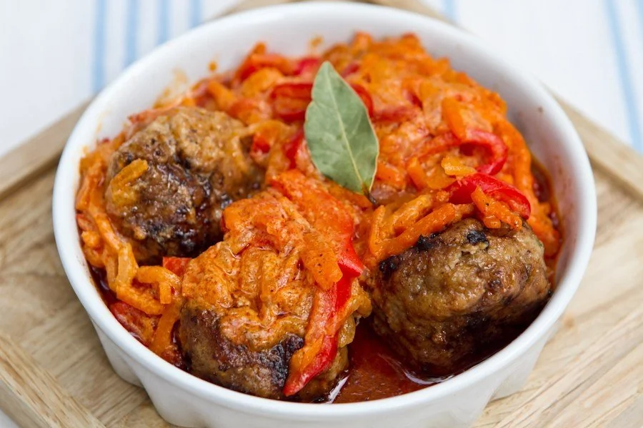 Творог Смешанный фарш Яйцо куриное Лук репчатый Сметана Чеснок Горчица Белый хлеб Петрушка Молоко Соль Перец черный молотый Морковь Мясной бульон Сладкий перец Помидоры Томатная паста Основные блюда Греческая кухня Тефтели