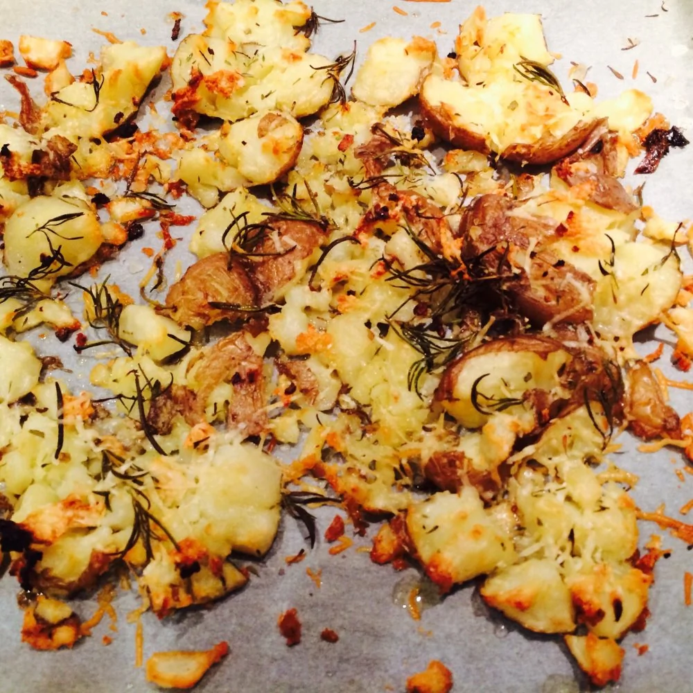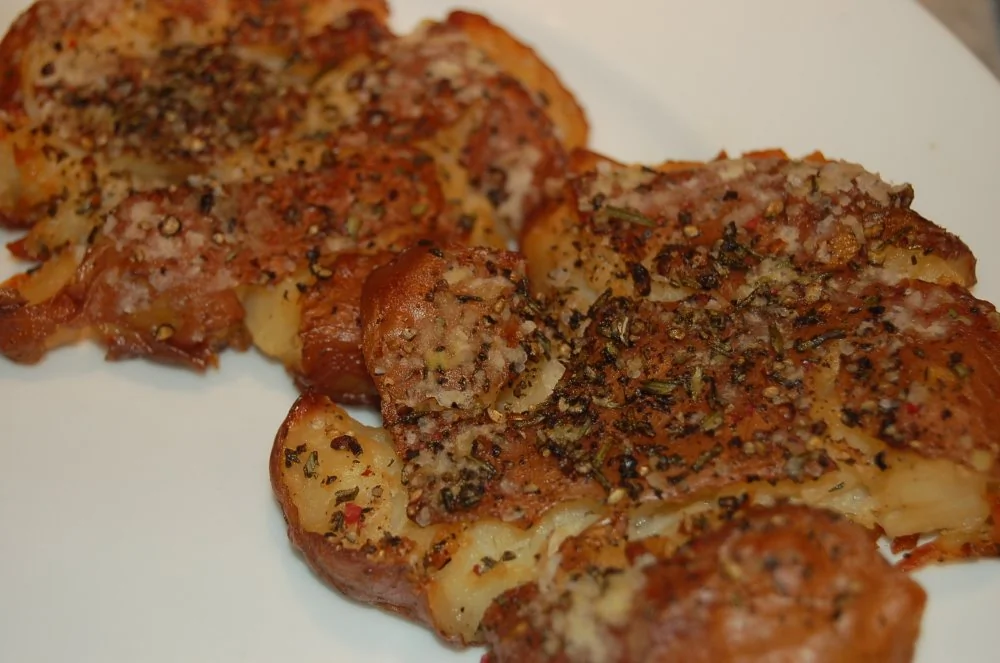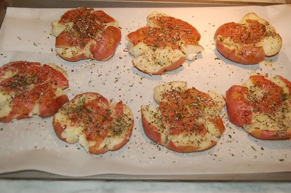 ШАГ 6 Смажьте оливковым маслом, посыпьте крупной солью, свежемолотым перцем, посыпьте свежим измельченным розмарином, по желанию измельченным чесноком и тертым сыром пармезан. Если вы желаете, чтобы картошка имела золотистую корочку с обоих сторон, раздавив и смазав картофель, можно выпекать 15 минут с одной стороны, перевернуть на 2-ю сторону, а только потом сдобрить маслом, специями и сыром, вернуть в духовку и выпекать еще минут 15.