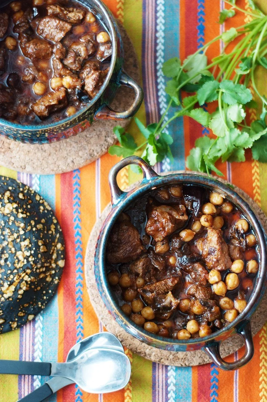 ШАГ 5 Добавить тертые томаты и горячий бульон к нуту, довести до кипения. Выложить баранину в кастрюлю вместе со всеми соками и чернослив, размешать получившийся соус и отправить в духовку. Если посуда не подходит для духовки, переложите соус в подходящую, например, горшки для чанахов. Мясо должно быть полностью покрыто жидкостью.