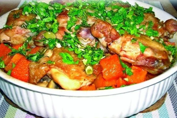 ШАГ 6 Перекладываем курицу к тыкве и посыпаем чесноком и рубленной зеленью, возвращаем форму в духовку и доводим до готовности, 20–25 минут приблизительно.
