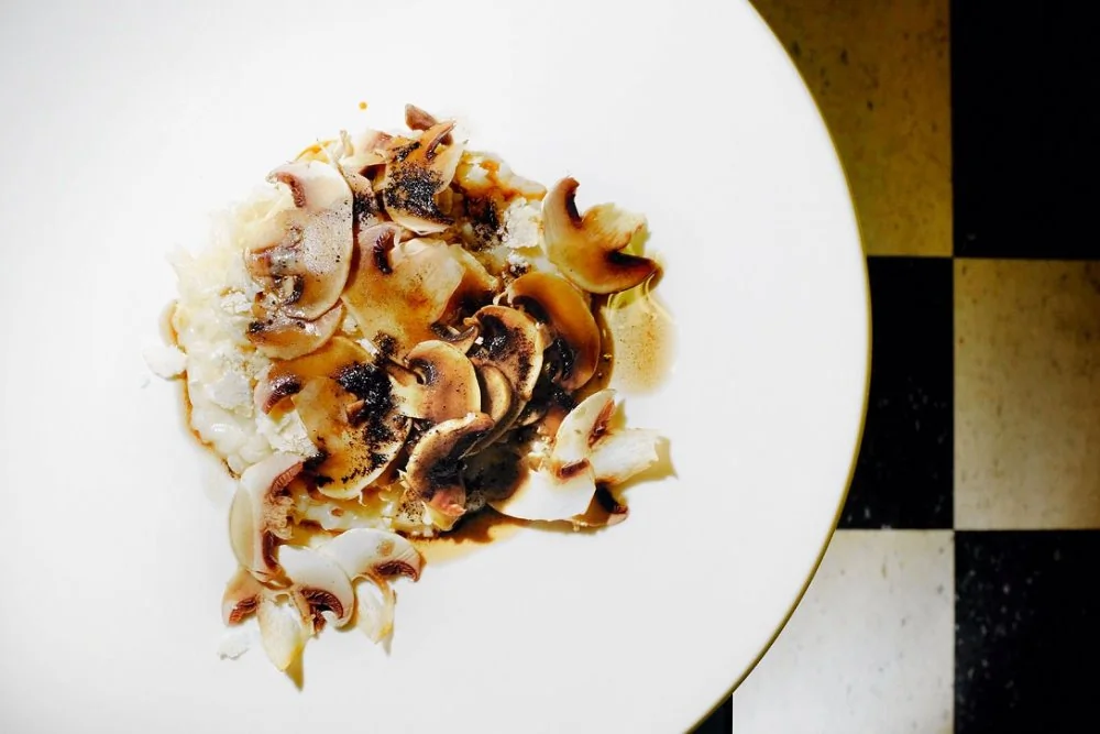 ШАГ 1 Для грибного пюре 225 грамм шампиньонов обжарить на половине масла канолы на среднем огне до золотистости. Добавить два зубчика чеснока и репчатый лук (нарезанные). Подождать, когда поджарится чеснок. Добавить тимьян. Деглазировать сливками, уменьшить огонь и готовить, пока сливки не упарятся наполовину. Взбить блендером, посолить, поперчить, приправить уксусом. Оставить в теплом месте.