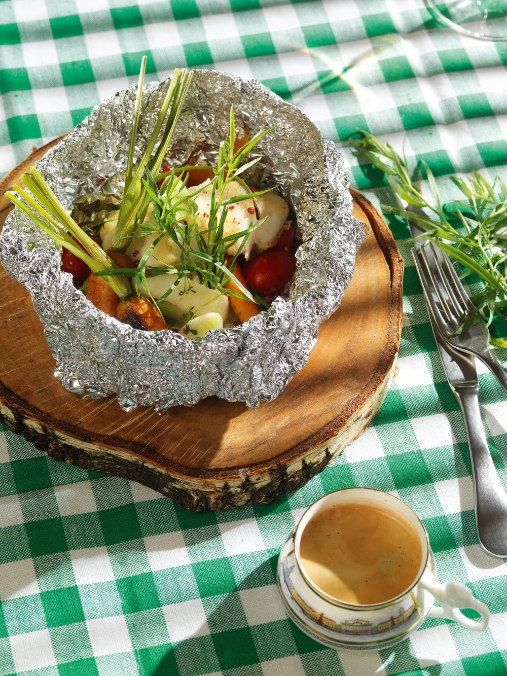 ШАГ 2 Форму для выпечки или противень выстелить фольгой, полить ее оливковым маслом, добавить белого вина. Выложить овощи, поверх них рыбу, добавить лавровый лист и прочие специи. Накрыть фольгой.