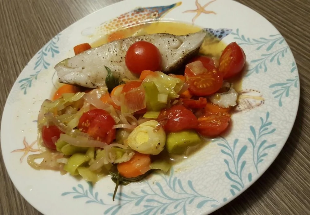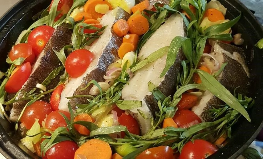 ШАГ 1 Кусок палтуса разрезать надвое. Порей, шалот и морковь нарезать крупно, помидоры разрезать надвое.