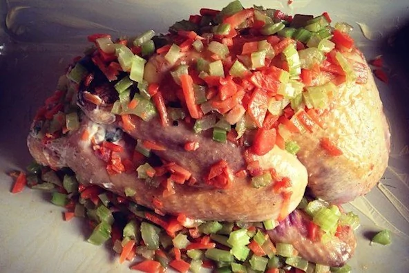ШАГ 6 Разогреть духовку до 180–200 градусов, положить на смазанный противень цесарку (можно использовать пергаментную бумагу) и обсыпать ее сельдереем и морковью, посолить и поперчить. Поставить противень с цесаркой в духовку на час. Проверять готовность очень просто, точно так же как и курицу, проткнув бедро. Сок сочащийся из бедра должен быть прозрачного цвета. Подавать цесарку без гарнира, начинка вполне заменит его.