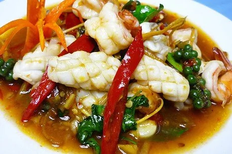 ШАГ 4 Добавляем морепродукты и жарим на сильном огне практически до полной готовности (минут 5 максимум). Выливаем рыбный соус, высыпаем сахар и сладкий чили, кладем листья кафир-лайма.