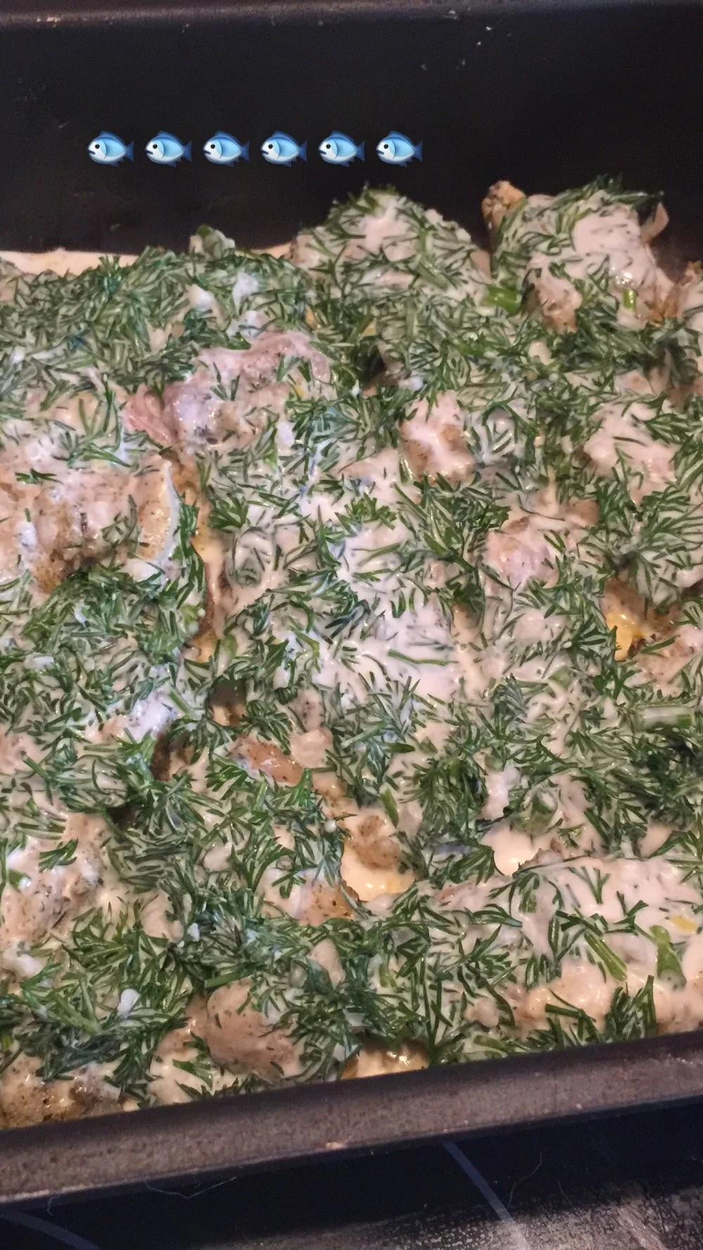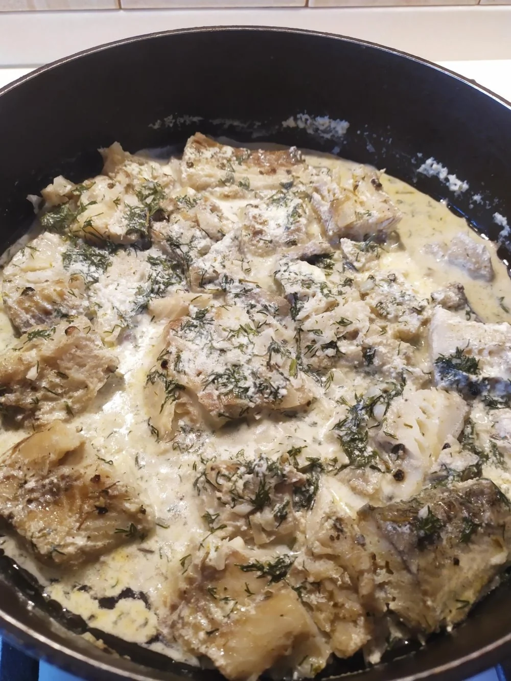 ШАГ 3 В отдельной емкости смешать сметану, майонез, мелконарезанный укроп, давленый чеснок, немного соли. Залить получившейся смесью рыбу на сковороде, убрать огонь, перемешать рыбу с соусом лопаткой, накрыть крышкой и тушить минут 15.
