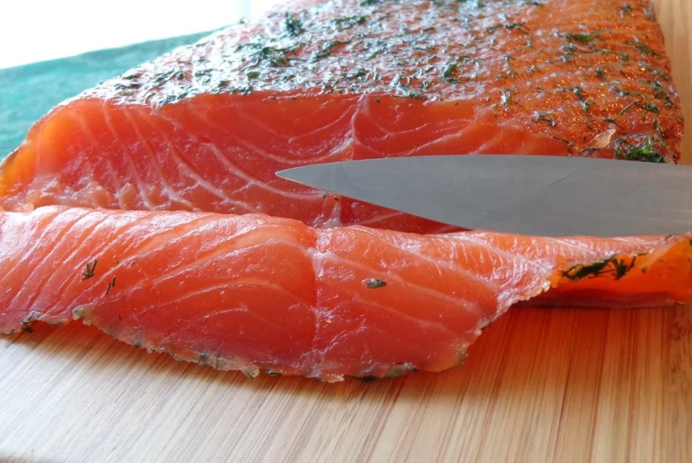 ШАГ 6 Готовый лосось «Гравлакс» освободить от пищевой пленки и тщательно счистить ножом с рыбного филе укроп и пряности. Обсушить филе бумажными полотенцами и нарезать тонкими ломтиками.