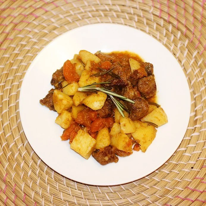 ШАГ 1 Овощи очистить и крупно нарезать. Так же нарезать мясо, посолить и обжарить в разогретом масле, по 3 минуты с каждой стороны. Добавить лук, чеснок, морковь, листики розмарина. Готовить, помешивая, 5 минут.
