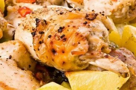 ШАГ 6 Подать цыпленка в этом соусе. Гарнировать баклажанами с помидорами и предварительно поджаренным картофелем.