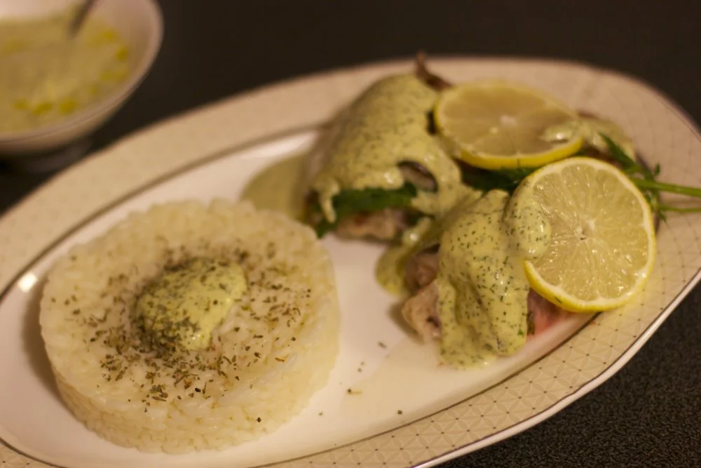 ШАГ 4 Подавать рыбу горячей, полив соусом сверху, гарнировать рисом, предварительно посыпав базиликом.