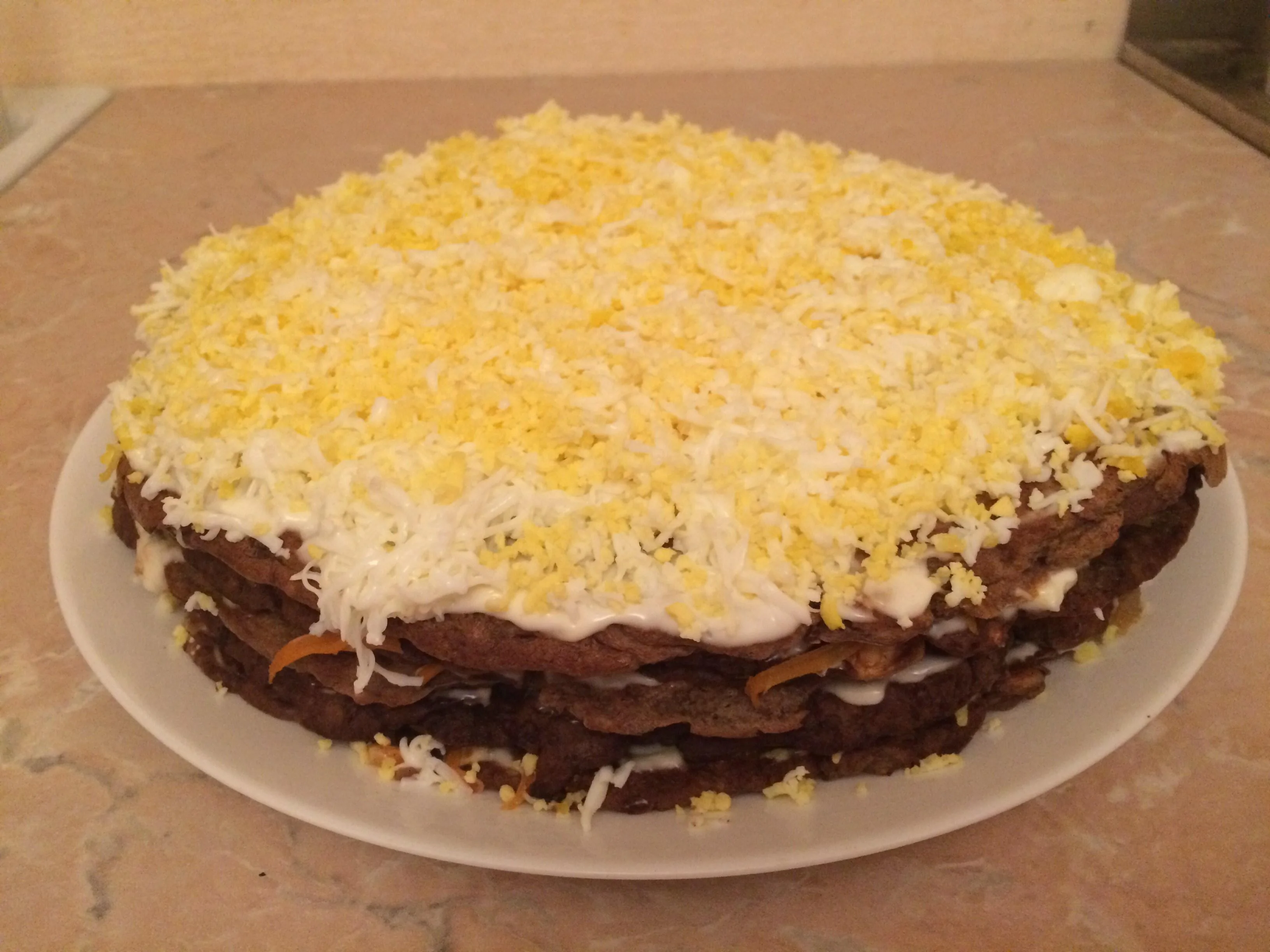 ШАГ 3 Каждый блин намазать смесью чеснока и майонеза, сверху положить морковь с луком. На последний блин положить только чеснок с майонезом.