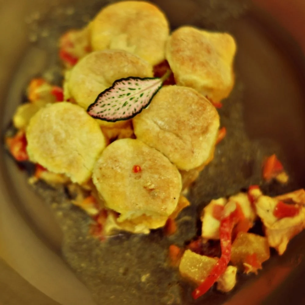 ШАГ 7 Тем временем берем форму для выпекания, выкладываем туда смесь из куриного филе и овощей. Сверху выкладываем лепешки, рядышком(как будто мостим камнем).