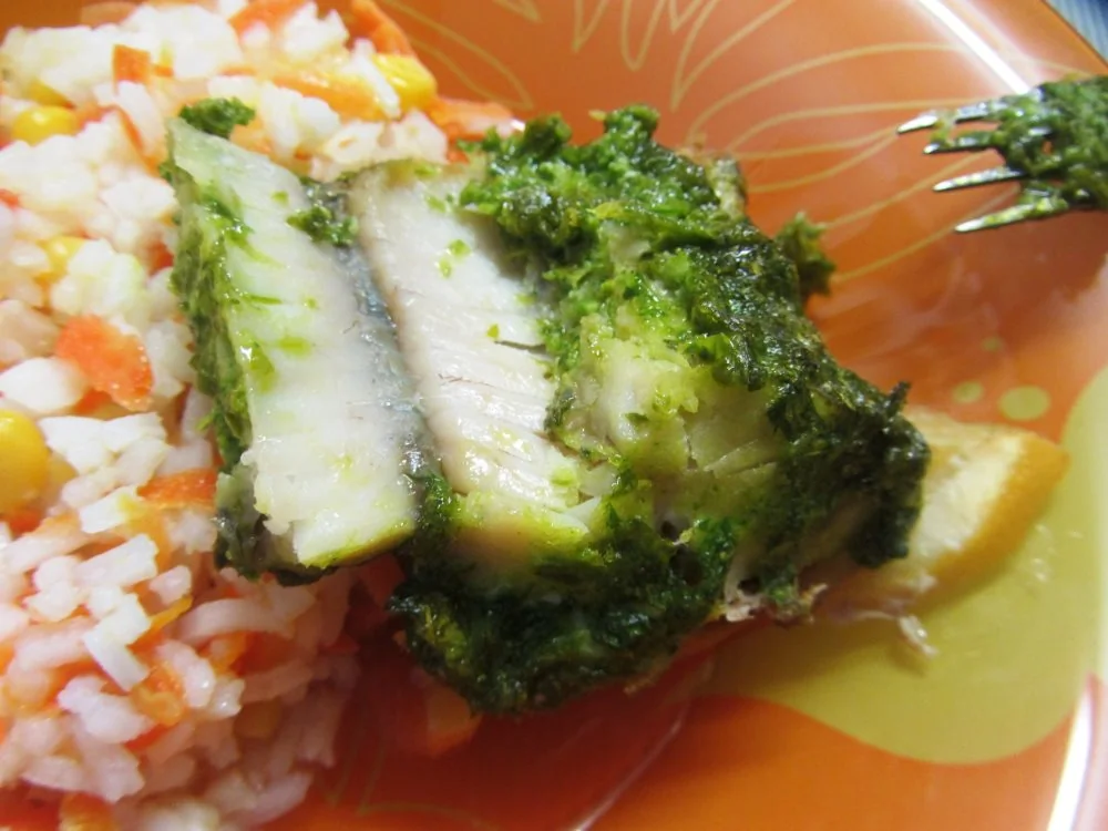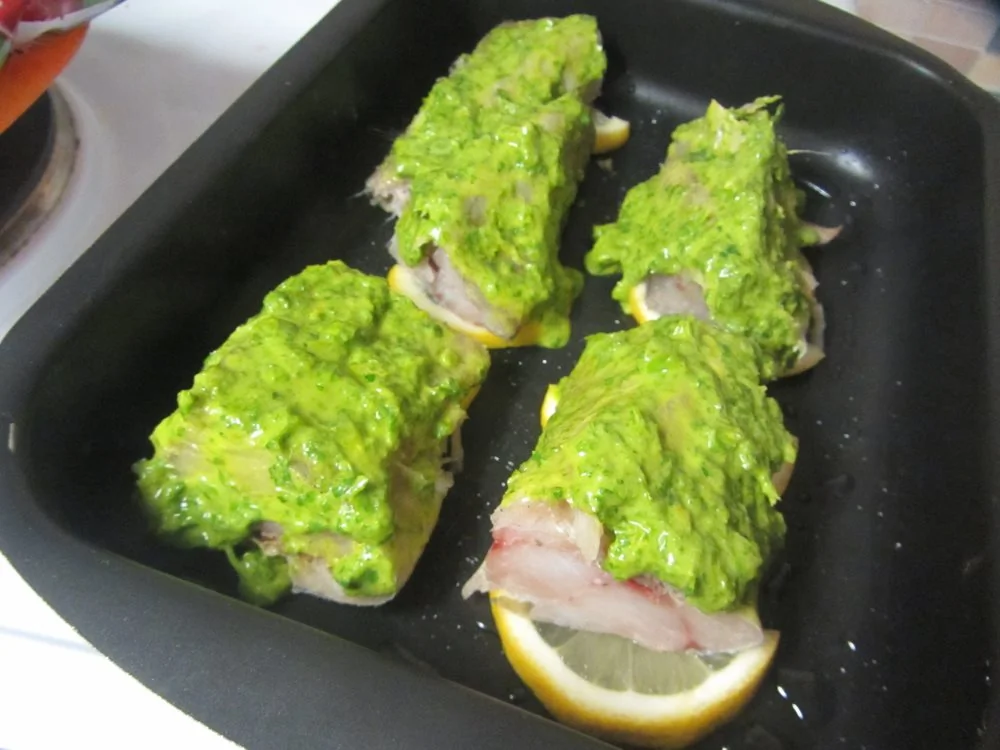 ШАГ 7 Равномерно нанести пасту из петрушки на минтай.