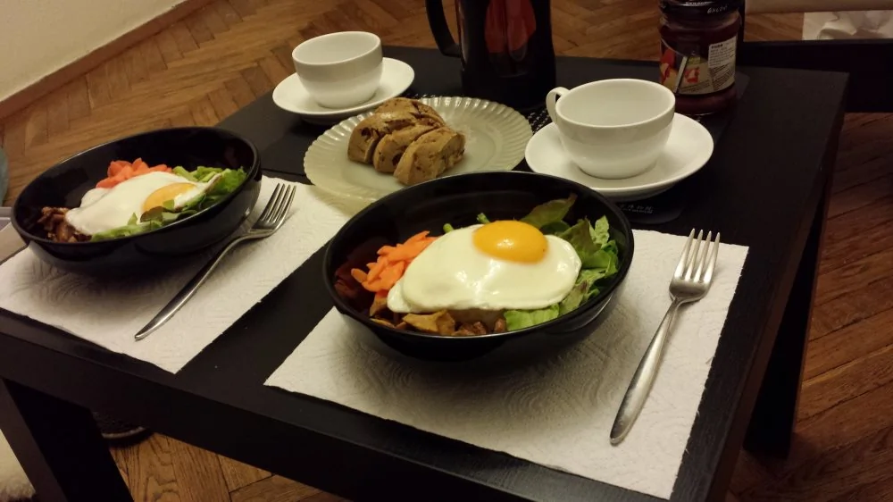 ШАГ 8 Пожарить яйца (каждое отдельно, не давая им перемешаться), так, чтобы желток оставался сырым, а белок был готов. Яйца выложить сверху на рис и овощи.