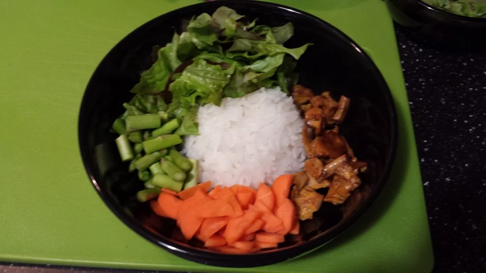ШАГ 7 Выложить рис при помощи маленькой чашки в середину большой глубокой тарелки. По краям выложить шпинат, кабачки, морковь, спаржу, грибы.