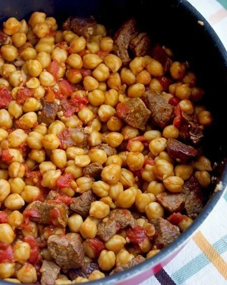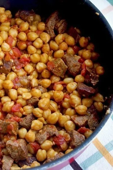 ШАГ 7 Как только нут и говядина потушились, добавляем к ним помидоры. Перемешиваем. Добавляем соль, перец, паприку, перец чили, снова перемешиваем, добавляем немного воды, и тушим под крышкой на среднем огне 20–30 минут.