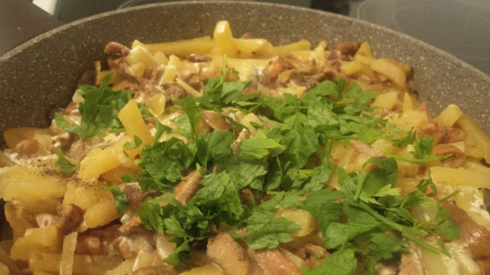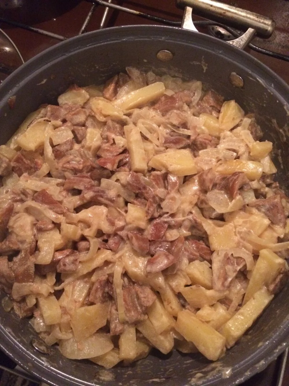 ШАГ 6 Жарим до готовности картошки. Это занимает 15–20 минут. После этого добавляем пол стакана сметаны, перемешиваем, выключаем огонь и даем настояться 5–7 минут под крышкой.