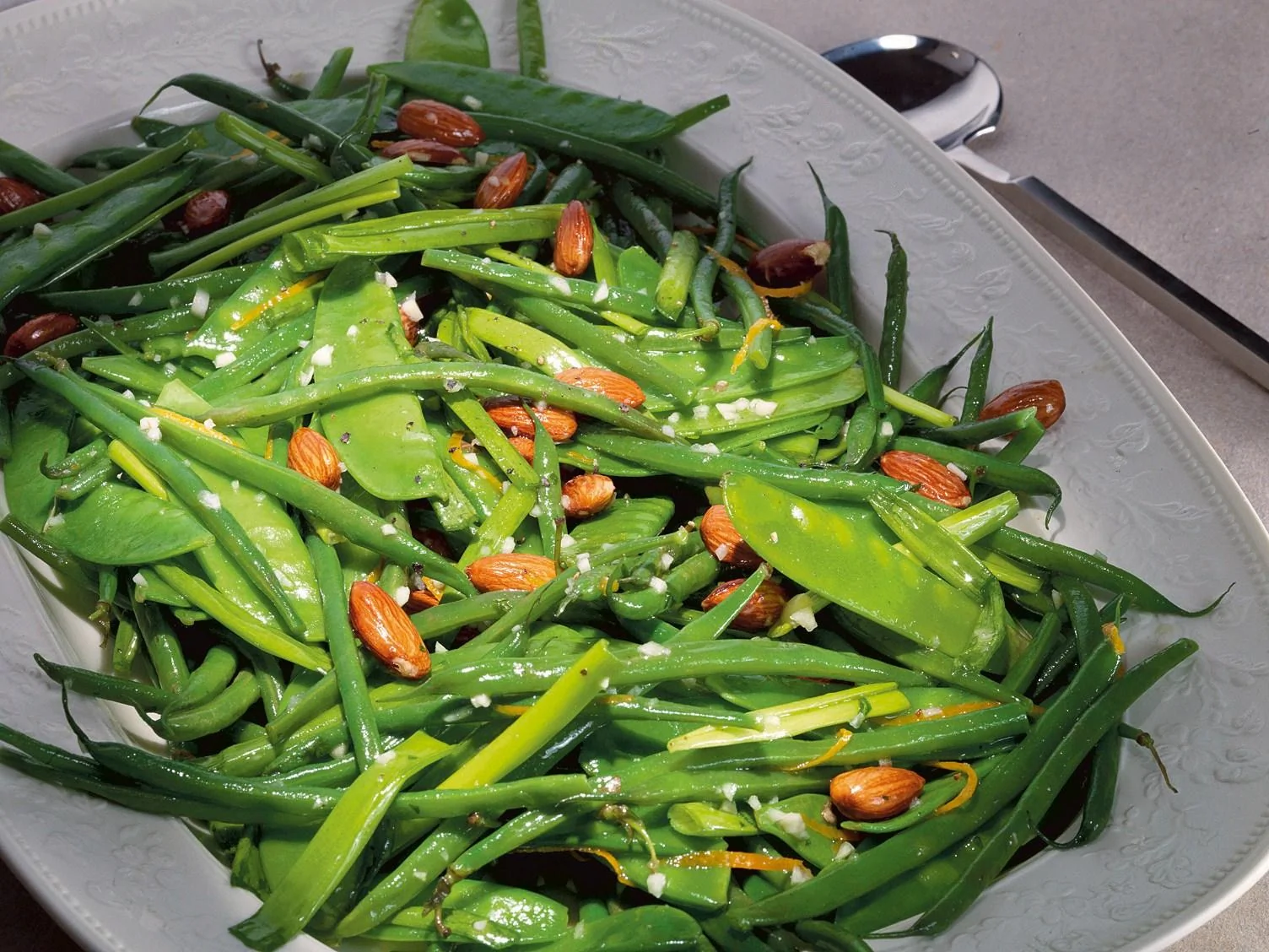 Кенийская фасоль и горошек с миндалем и цитрусовым соусом