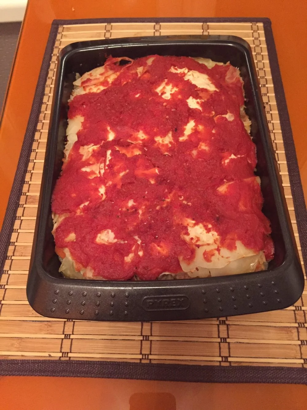 ШАГ 10 Взять блюдо для запекания, уложить слоями: капустные листья, фарш, посыпать рисом слегка, опять капустные листья, фарш, рис, завершить капустными листьями, смазать сметаной верхний слой. Вместо сметаны возможно смазать верхний слой томатным соусом.