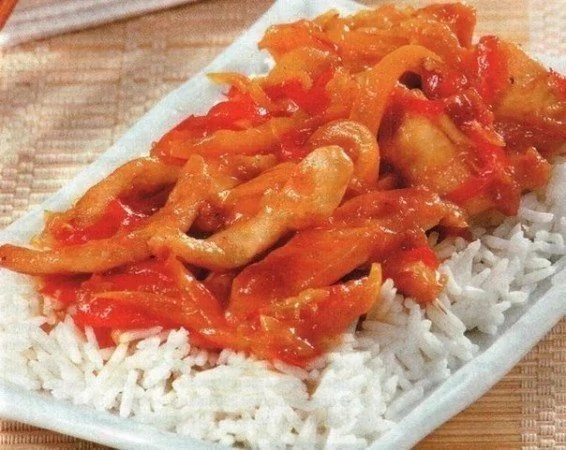 ШАГ 3 Перец нарезаем полосками, лук — полукольцами. Обжариваем овощи в той же сковороде, что и филе, около 5–7 минут.