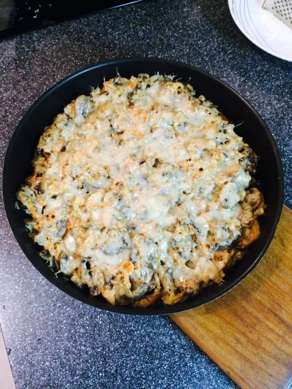 ШАГ 3 Тем временем, обжарить в 2 ст. л. масла грибы, 4 минуты. Добавить соль, перец, мускатный орех и муку. Тщательно перемешать и готовить на небольшом огне 10 минут. В отдельной сковороде обжарить в оставшемся масле оставшийся лук, 5 минут. Влить 2 ст. л. воды и готовить под крышкой 10 минут. Добавить грибы и сливки, довести до кипения и сразу же снять с огня.