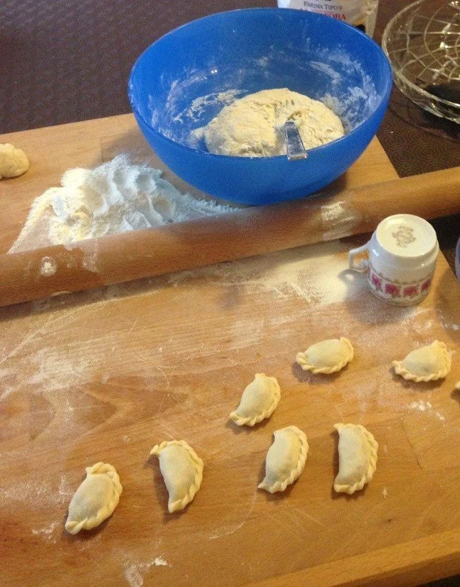 ШАГ 3 От готового теста взять часть, раскатать скалкой толщиной 1–2 мм или как можно тоньше, выдавить кружкой из пласта кружочки диаметром 4–5 см, положить внутрь чайную ложку готового фарша и склеить обе половинки между собой. Затем склеенный край завернуть косичкой, чтобы выглядели более красиво.