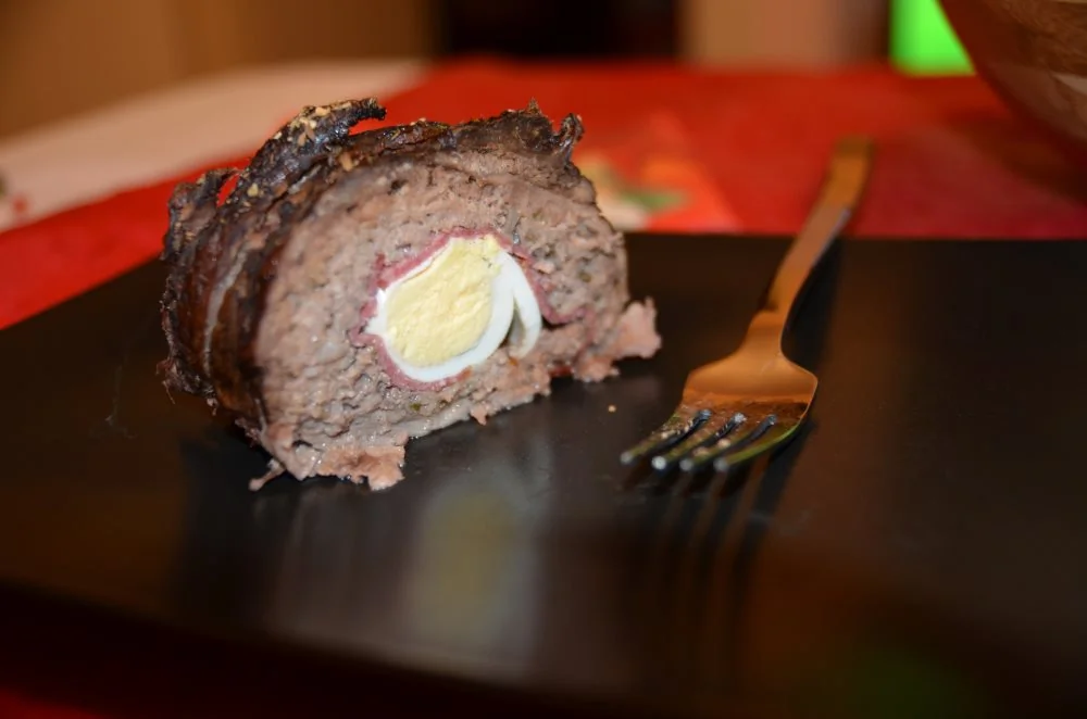 ШАГ 4 Положить пищевые пленки с ломтиками говядины на ровную рабочую поверхность, верхнюю пленку снять, на говядину выложить фарш — он должен быть довольно вязкий, чтобы практически намазывался на говядину, от краев отступить примерно по паре сантиметров. Следующим слоем выложить салями — необходимо купить сразу нарезанную, потому что в домашних условиях так тонко нарезать не получится. Выложить в 2 слоя на фарш. Последний, так называемый, слой — вареные, очищенные от скорлупы, яйца, выложить их дорожкой на салями.