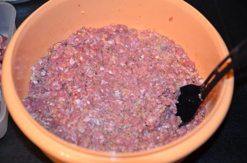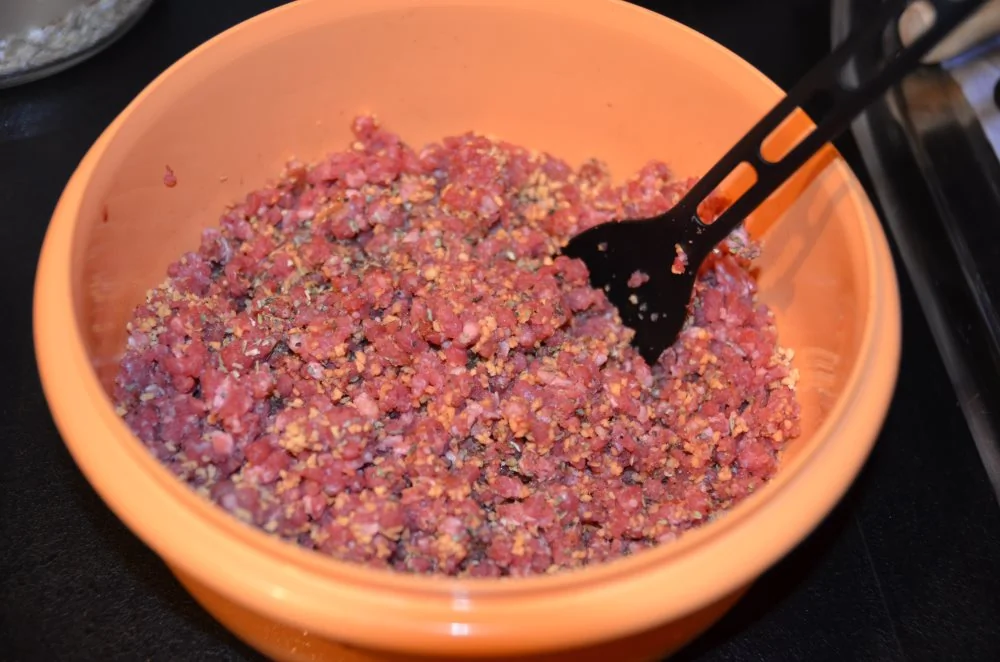 ШАГ 2 Фарш выложить в миску, добавить 1 сырое яйцо, все молотые сухари, орегано, молотый перец, измельчённый чеснок (лучше использовать пресс для чеснока, чтобы кусочки не попадались во время еды), если любите поострее, добавьте и красный жгучий молотый перец, хорошо перемешать, добавляя понемногу тёплую воду, чтобы фарш стал вязкой консистенции, отставить в сторону.