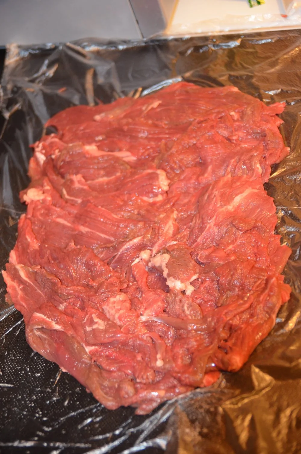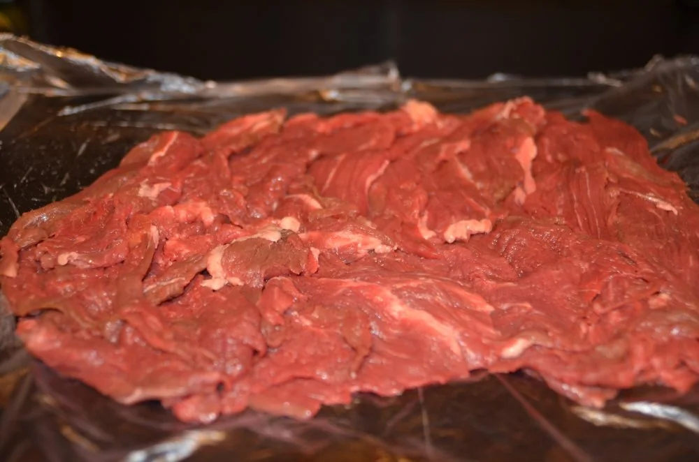 ШАГ 3 Вырезку разрезать напополам продольно, одну половину можно снова заморозить, вторую хорошо зачистить от пленок и фасций (если уже жарили стейки или запекали ростбиф, то знаете как это делать). Нарезать вырезку продольно на тонкие ломтики (можно и продольно, как удобно), выложить внахлест по типу косички на пищевую пленку и хорошо отбить между двумя слоями пищевой пленки или обычного целлофанового пакета, чтобы ломтики стали совсем тонкими. Нет молоточка для мяса? Используйте обычную скалку.