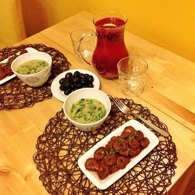 ШАГ 5 Чечевицу и чеснок (мелко нарезать) отварить до готовности в небольшом количестве воды (чечевица должна полностью развариться). Добавить оливковое масло и промытый и обсушенный шпинат, перемешать, накрыть крышкой и выключить нагрев. Дать постоять 3-5 минут, посолить, добавить немного острого перца по вкусу. Подавать вместе с сердечками в соусе из паприки.