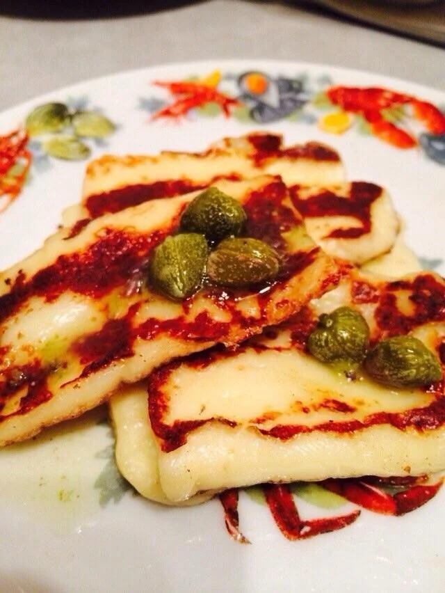 Жареный сыр халлуоми с заправкой из лайма и каперсов
