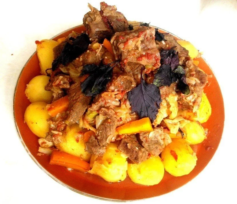 Баранина Лук репчатый Морковь Сладкий перец Помидоры Белокочанная капуста Чеснок Соль Перец черный молотый Кумин (зира) Красный базилик Петрушка Картофель Основные блюда Горячие закуски