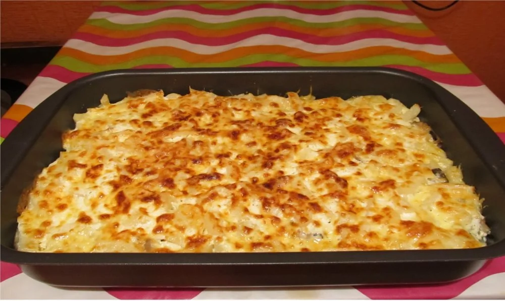 Когда запеканка из кабачков подрумянилась, вытащите ее, выложите грибы с луком, кружочки помидора, полейте остатками теста и притрусите тертым сыром.