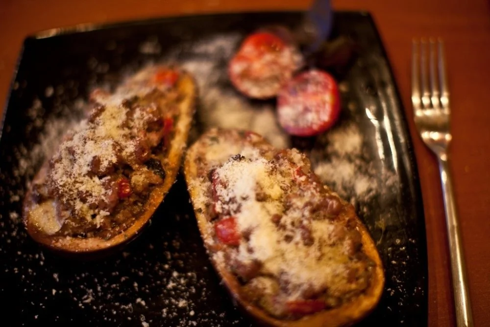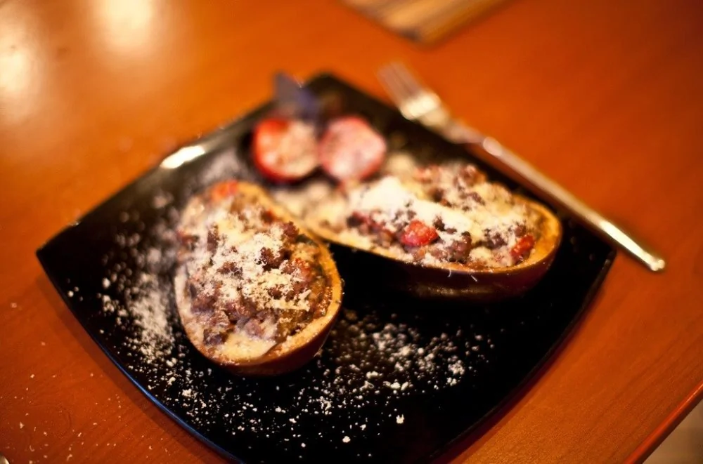 ШАГ 1 Баклажаны разрезаем на половинки и вынимаем мякоть, чтобы образовались «лодочки». Мякоть в сторонку.