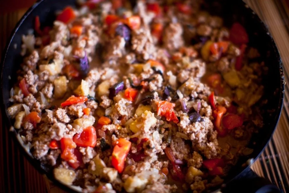 ШАГ 2 На сковороде обжариваем лук с чесноком(на оливковом масле), добавляем фарш, постоянно помешиваем, активно разбивая, чтобы не было крупных комочков. Можно добавить немного водички. Добавляем резаные помидоры и мякоть баклажана. Солим, перчим, добавляем резаную мелко зелень( у меня базилик).