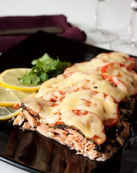 Лосось с маслинами и томатами