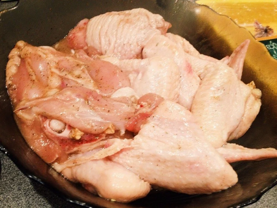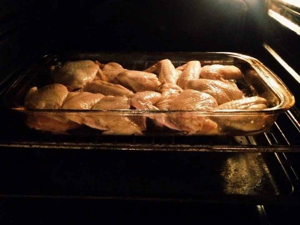 ШАГ 4 После чего достаем из холодильника и включаем духовку на 200 градусов. В это время протираем противень маслом и выкладываем курочку. И конечно поливаем получившемся соусом :)