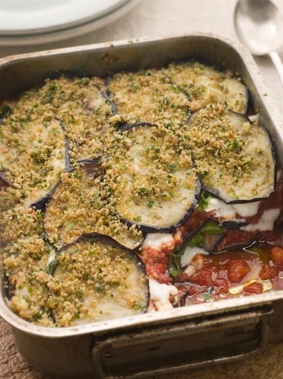 ШАГ 4 Смазать маслом форму для запекания с высокими стенками. Слегка покрыть дно томатным соусом. Затем уложить часть баклажанов.