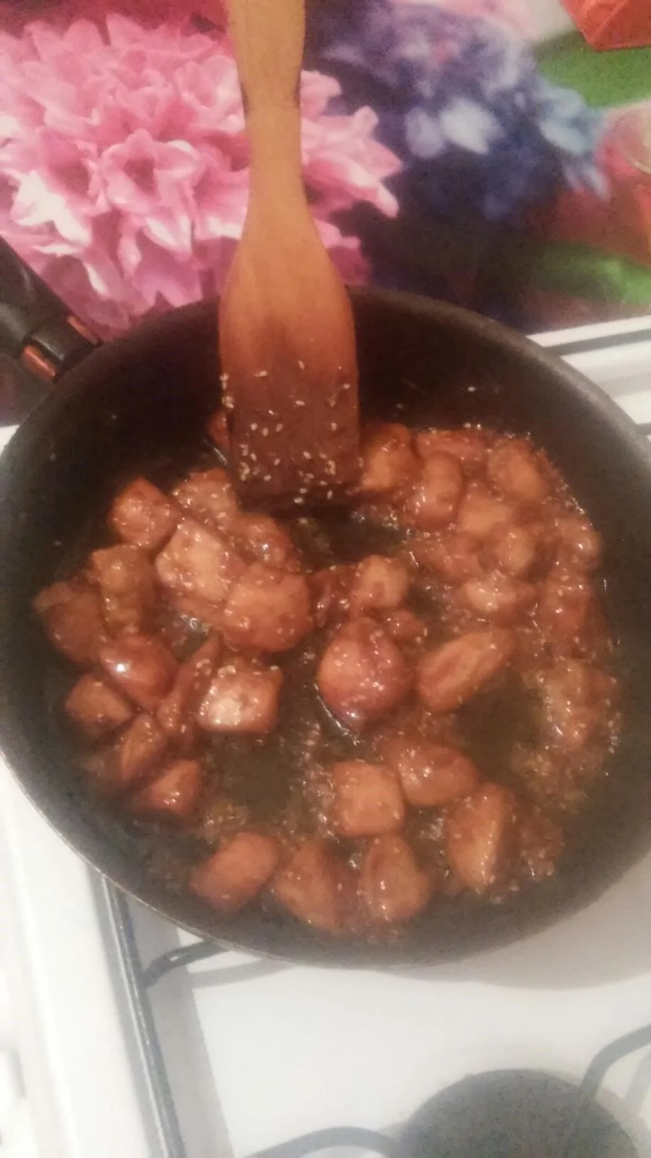 ШАГ 6 Выложите куриные грудки на сковороду и жарьте на медленном огне до золотистой корочки с двух сторон.В конце готовки посыпать горстью кунжутного семени, помешать, через пару минут снять с огня.