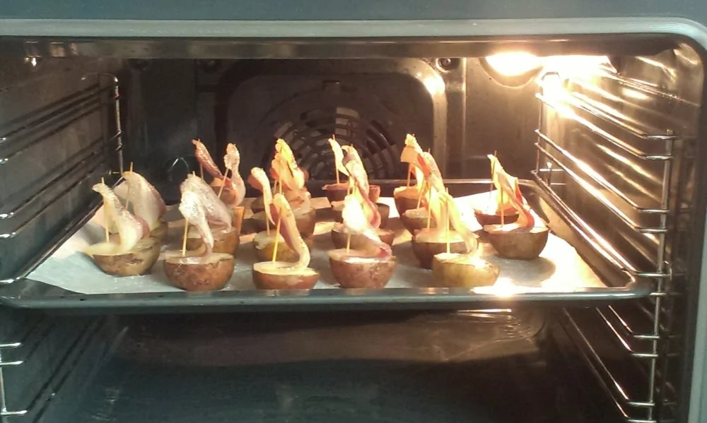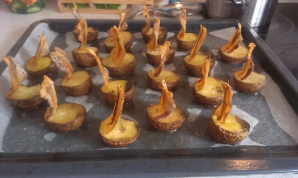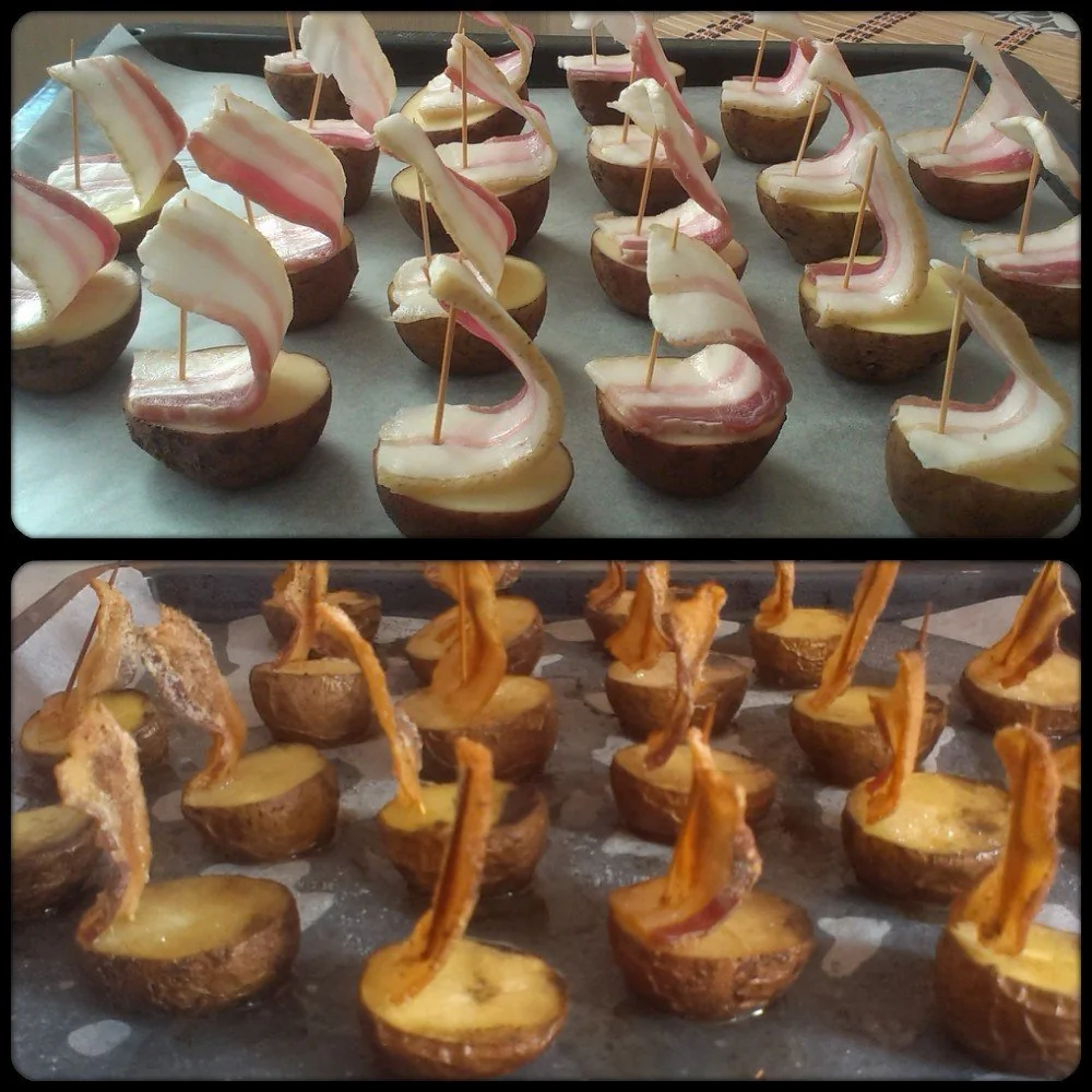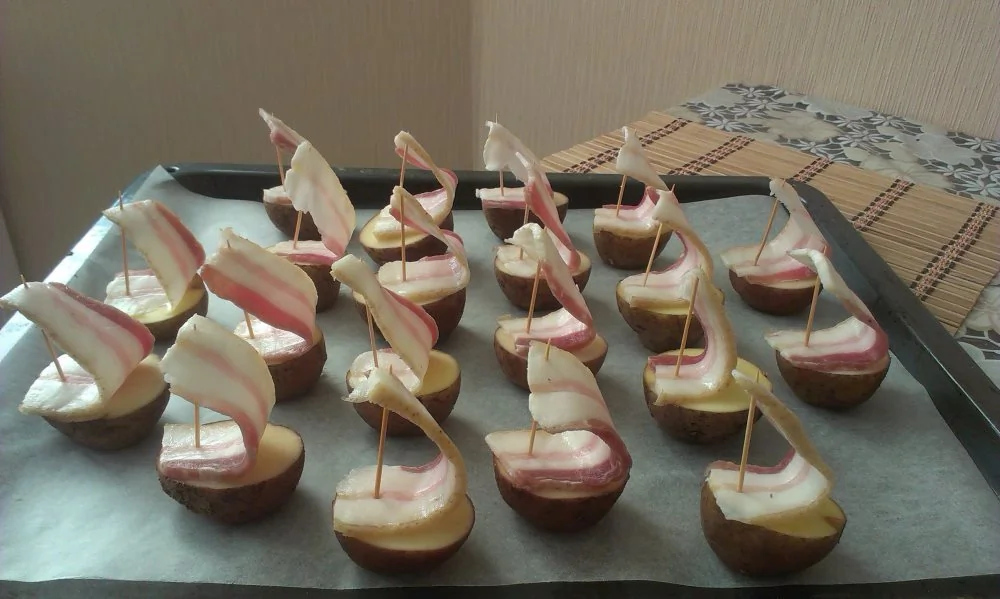 ШАГ 3 Картошку разложить разрезанной стороной наверх. Взять зубочистки и с их помощью надеть сало на картошку, чтобы сало напоминало паруса.