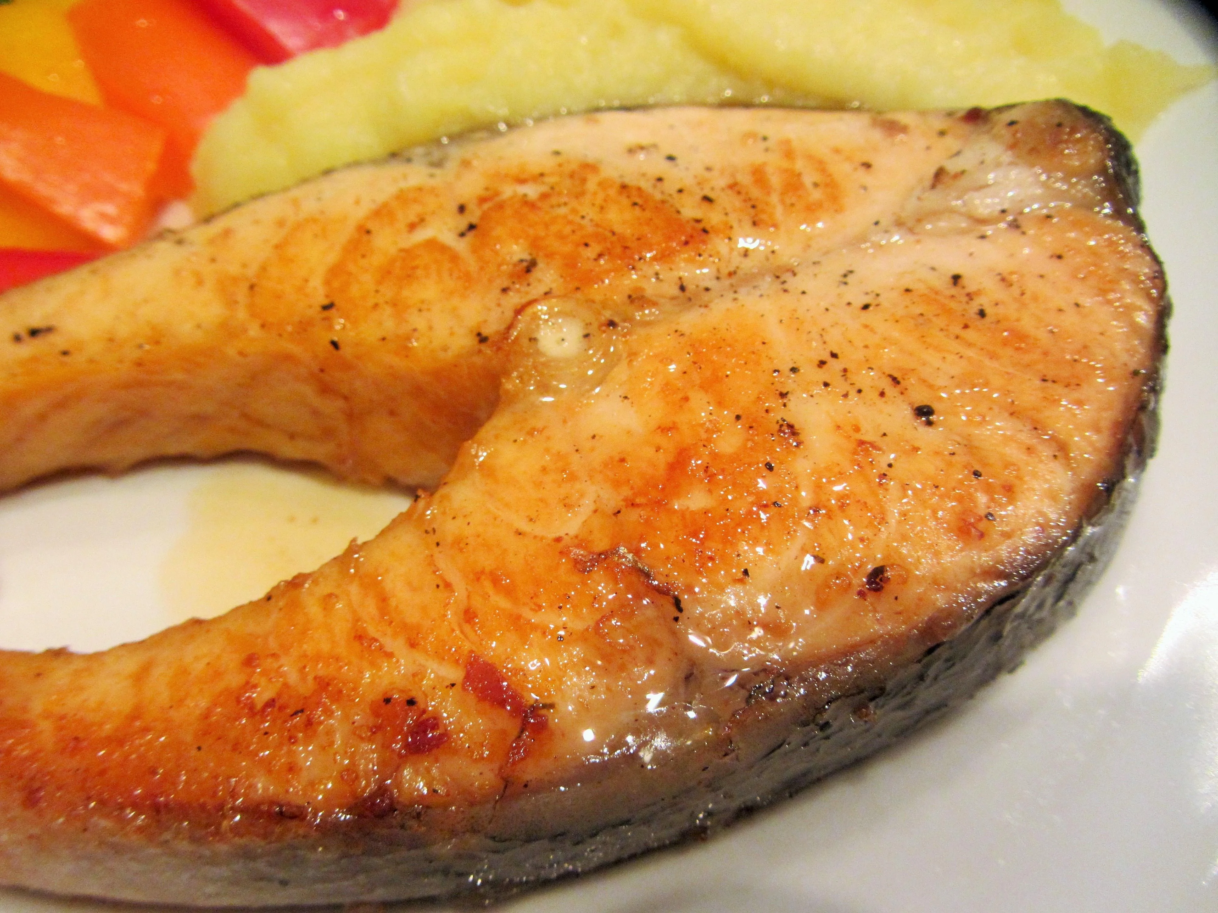 ШАГ 1 Разогретую сковороду смазать растительным маслом, положить филе семги, прижать на одну минуту.
