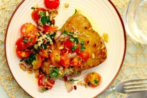 Ингредиенты для приготовления Жареный панированный тунец с салатом из помидоров и трав: