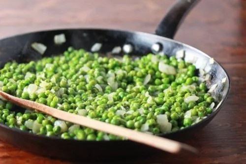 ШАГ 2 Добавить замороженный зеленый горошек и ложку воды. Приправить солью и перцем. Накрыть крышкой и тушить около 10 минут, пока горошек не станет мягким.